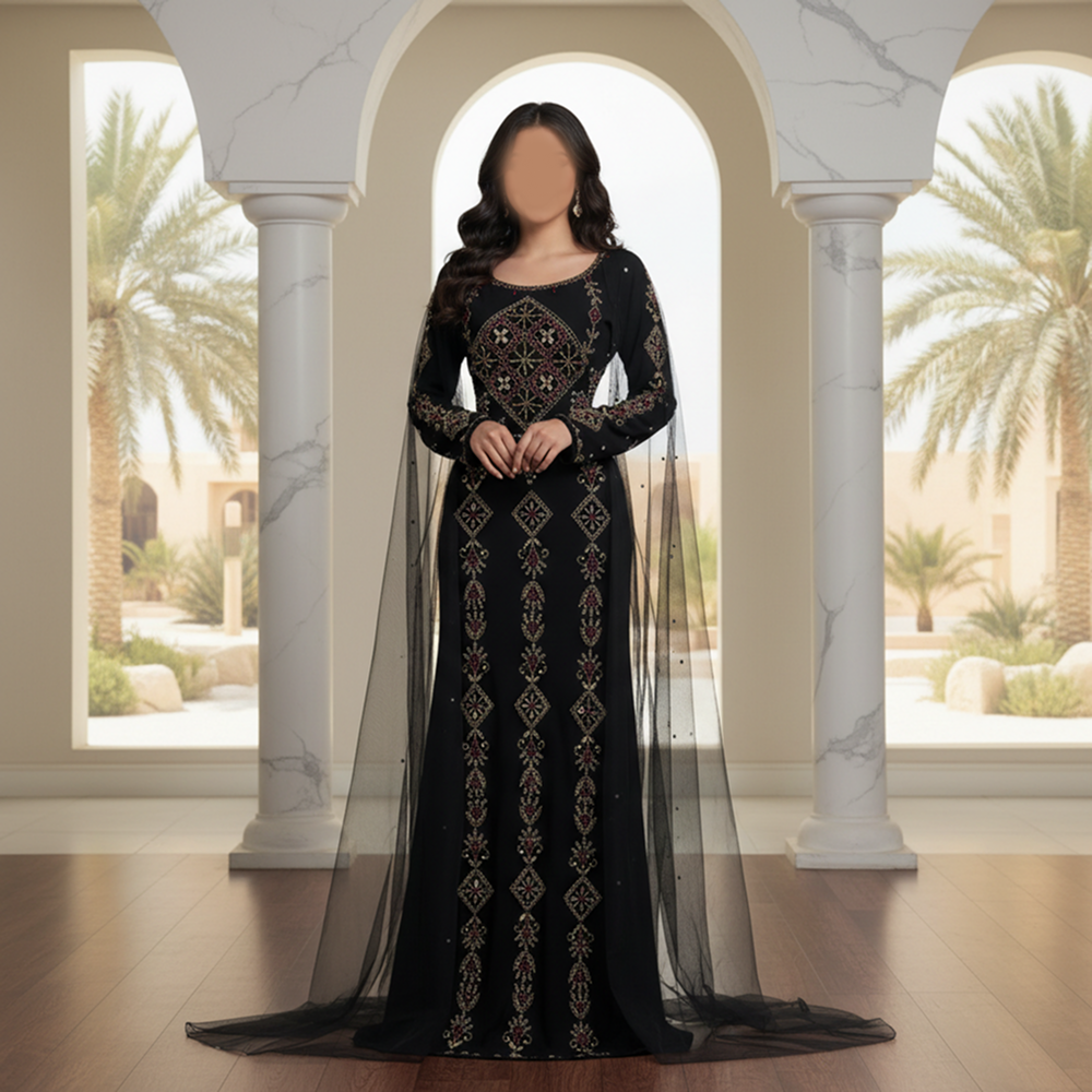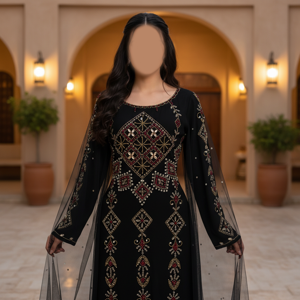 - التطريز: تطريز هندسي وتراثي باستخدام خيوط ذهبية وكريستالات لامعة