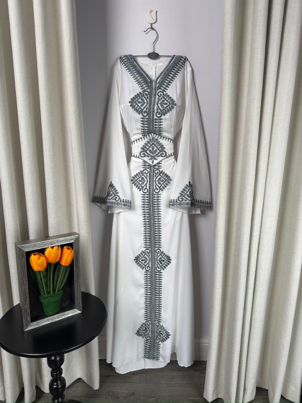 - التصميم: تطريزات هندسية دقيقة على الصدر والمنتصف والأكمام