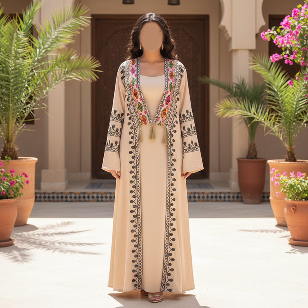 - التطريز الهندسي الملون والزخارف التراثية تضيف لمسة فنية وتاريخية، مما يجعل الجلابية مميزة في المناسبات.