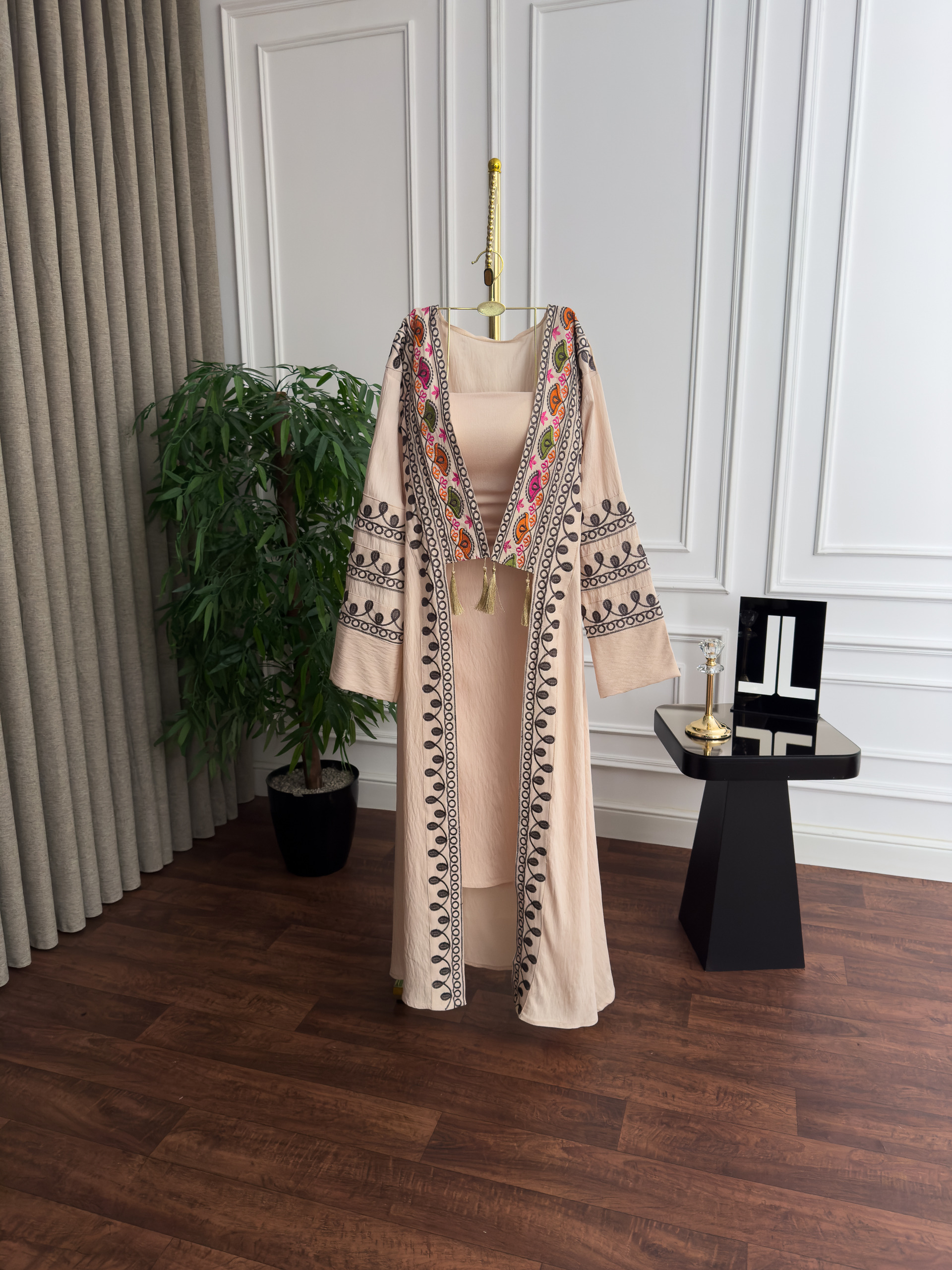 - القطع: فستان داخلي سادة مع بشت مفتوح ومطرز