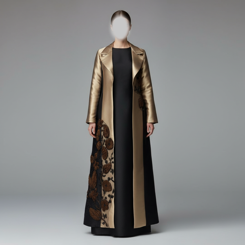 • التصميم: طقم مكون من فستان أسود داخلي سادة وعباءة طويلة مفتوحة