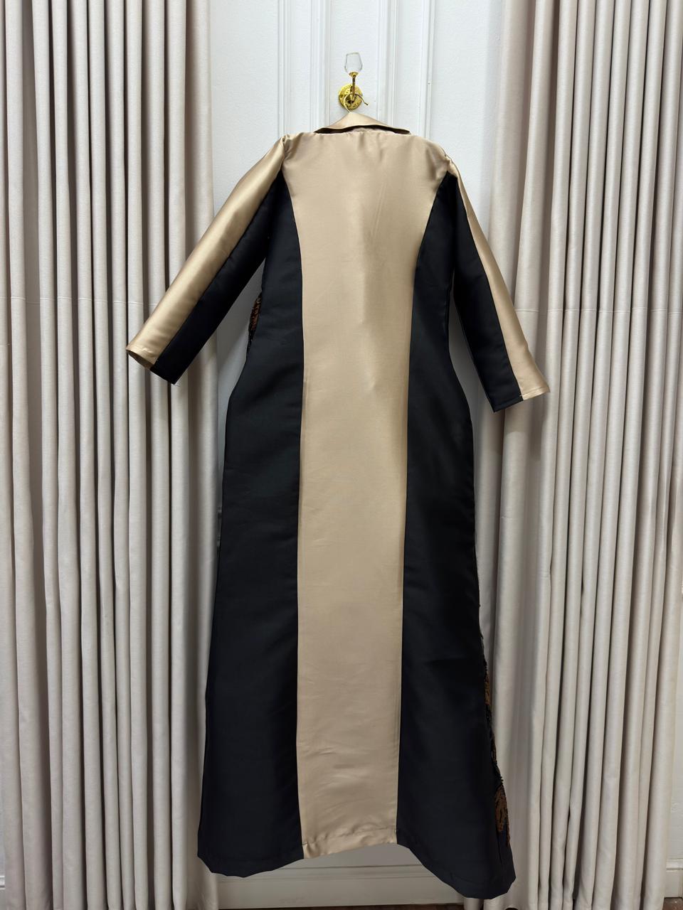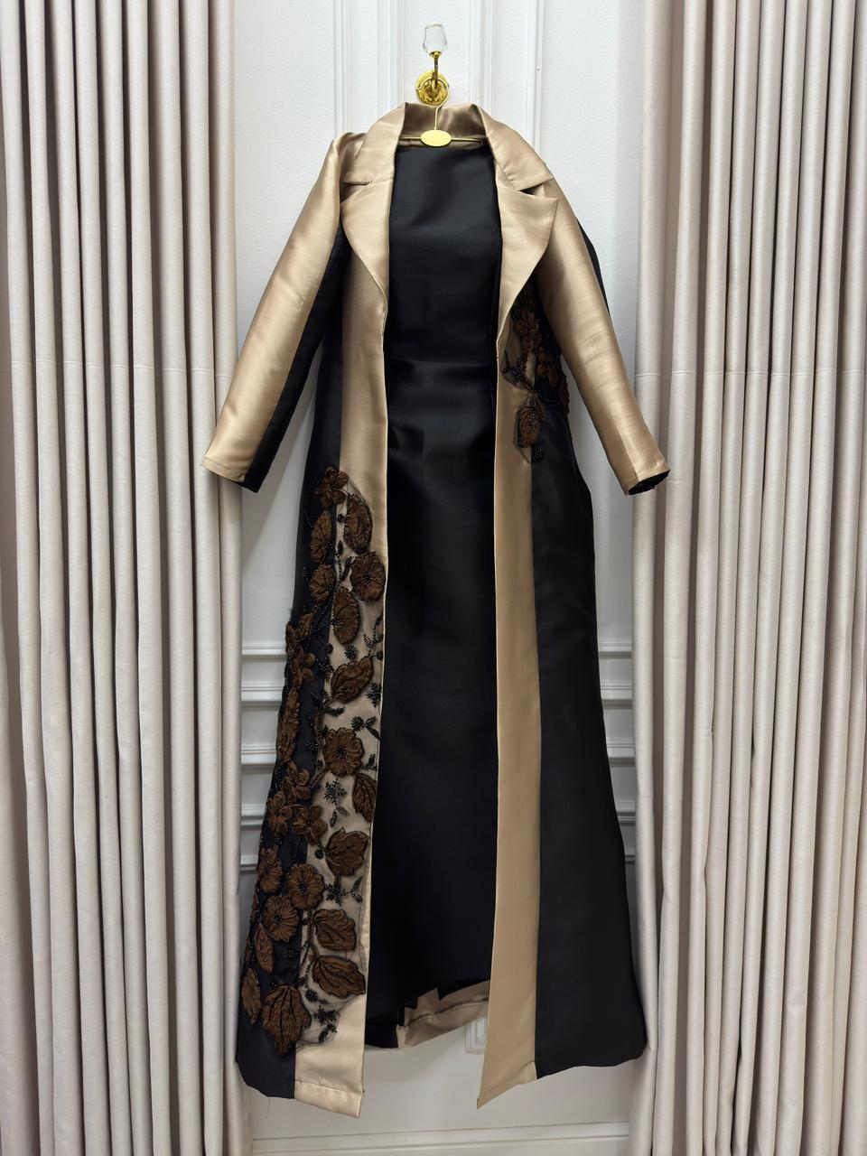 فساتين سهرة بلونين يجمع بين الفخامة والرقي في إطلالة طقم مكون من فستان وعباءة أنيقة. الألوان الكلاسيكية الأسود والذهبي تمنحكِ حضوراً مميزاً وساحراً في جميع المناسبات.