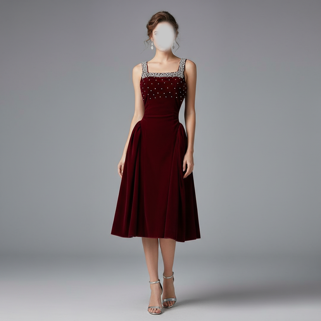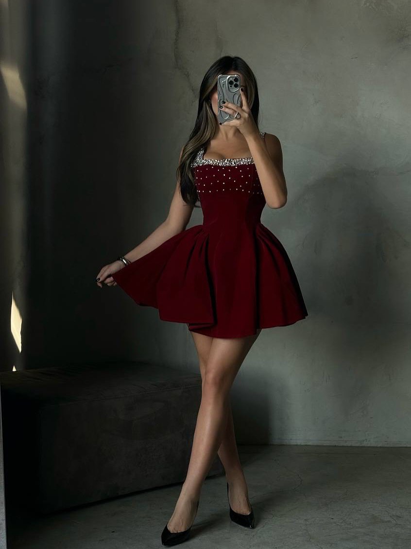 فساتين سهرة خمري يمنحكِ إطلالة ملكية أنثوية وأنيقة في كل مناسبة. تصميمه المخملي العودي والتطريز بالكريستال واللؤلؤ يضفي لمسة فخامة راقية ومتألقة.