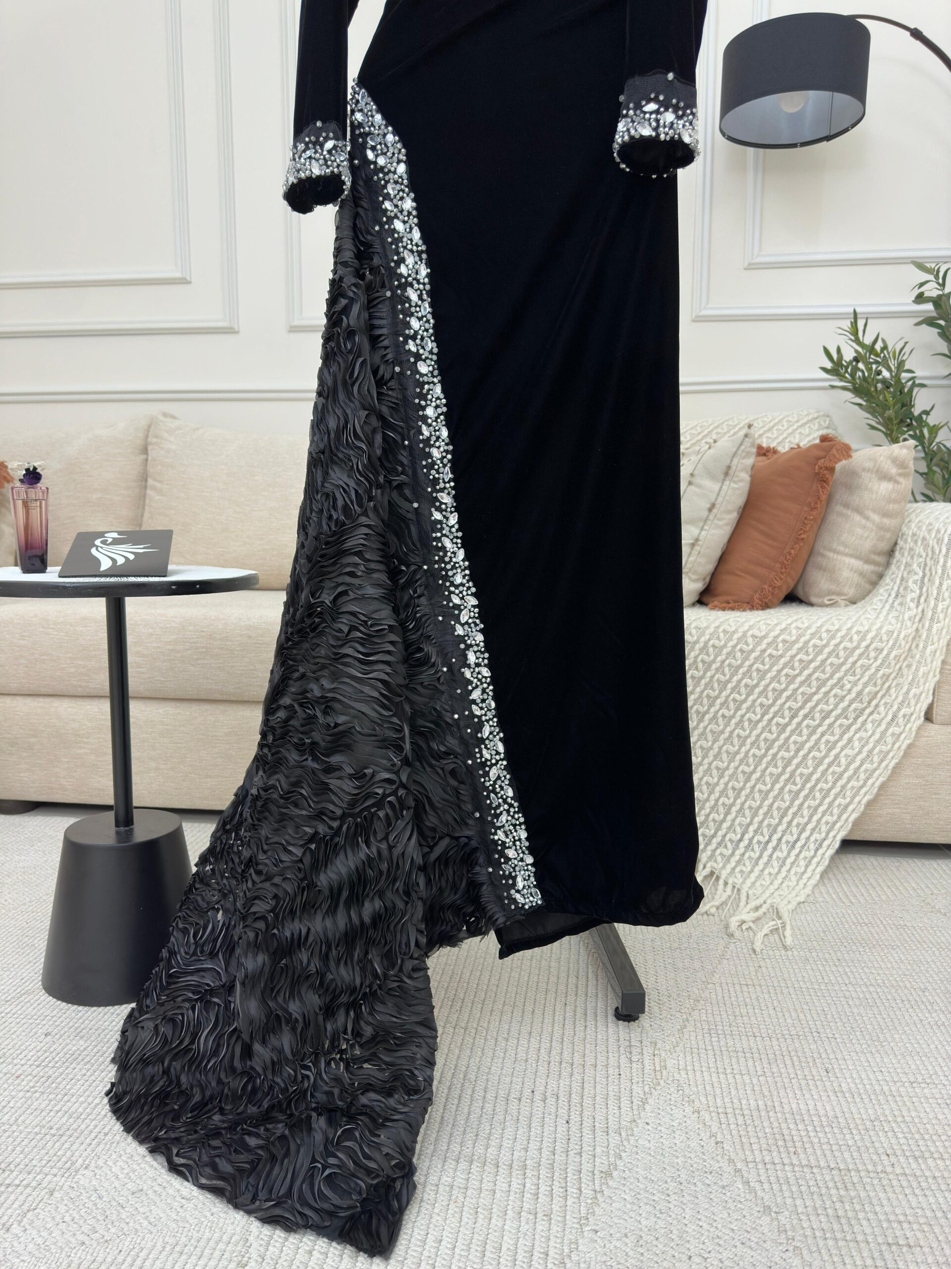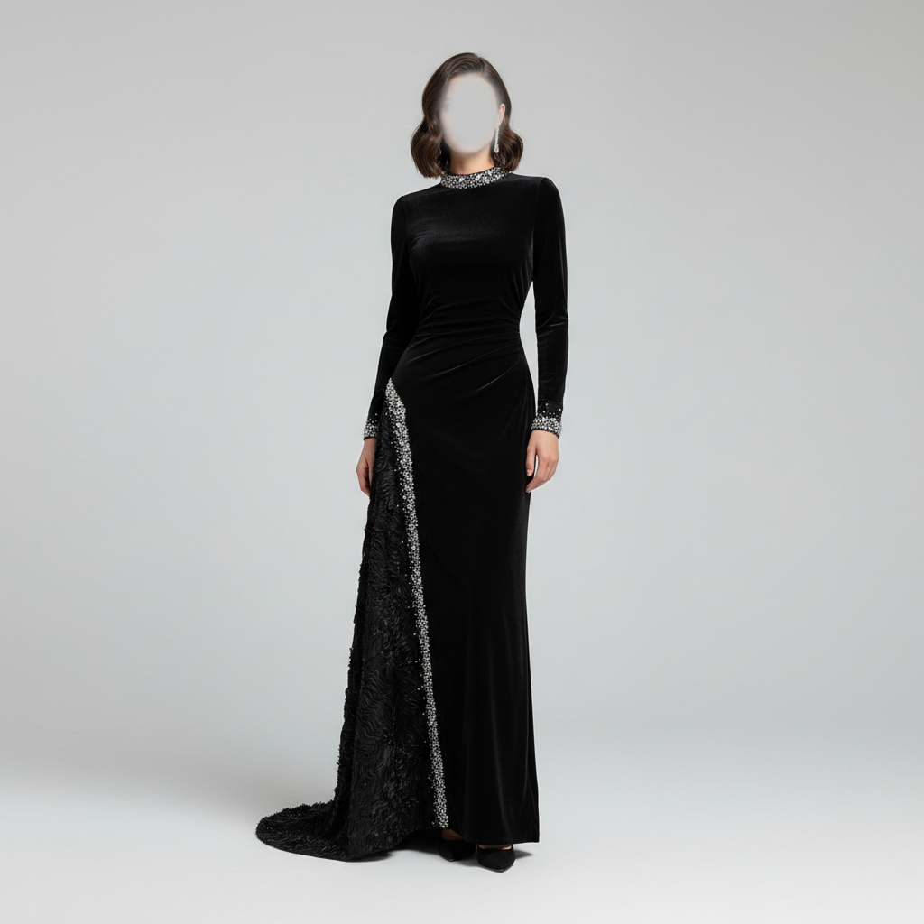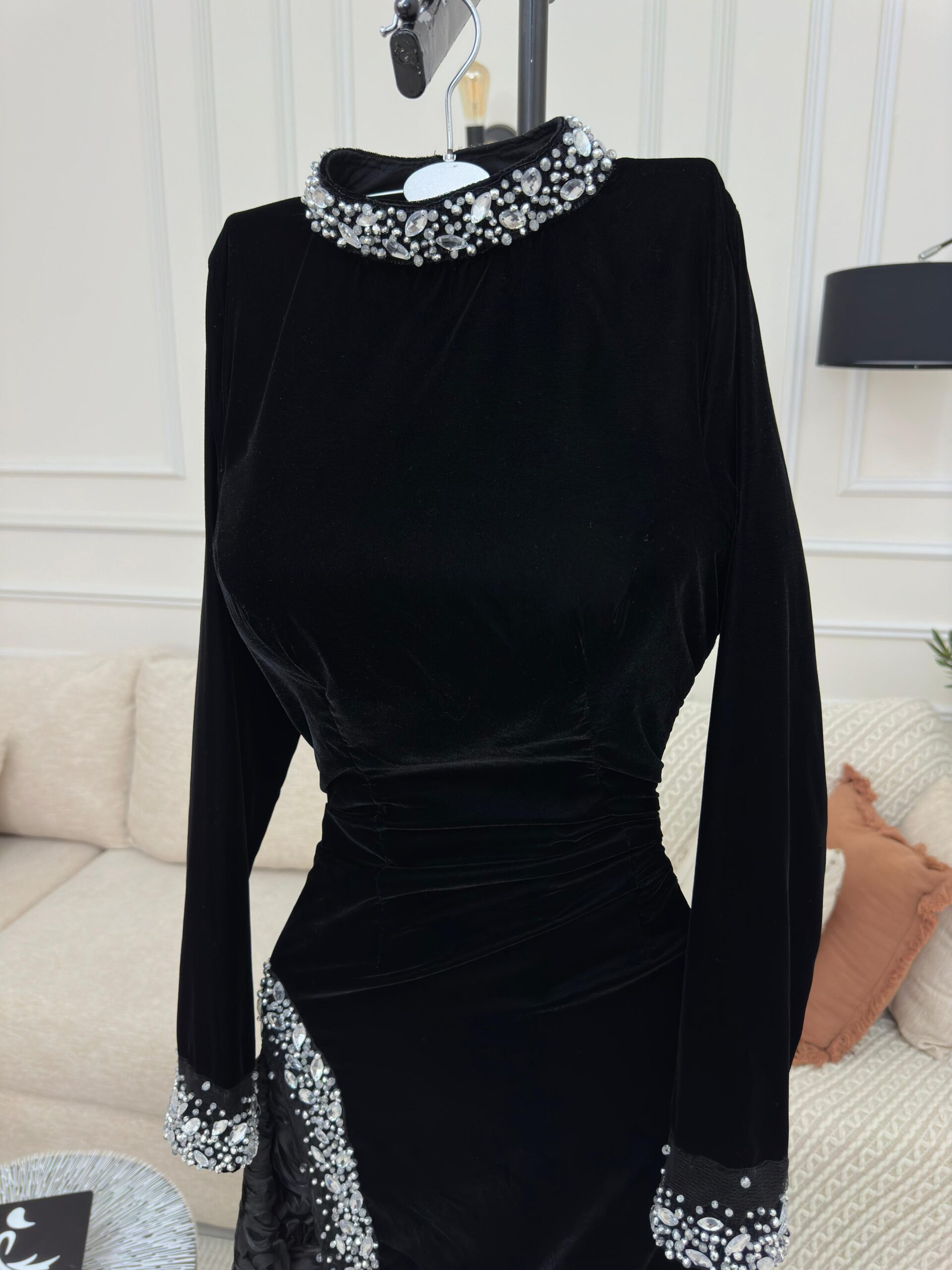 فستان اسود ضيق طويل يمنحك إطلالة ساحرة وأنيقة في كل سهرة. تصميمه المخملي مع لمسات التطريز اليدوي والكريستال يبرز القوام ويضفي لمسة فاخرة لا مثيل لها.
