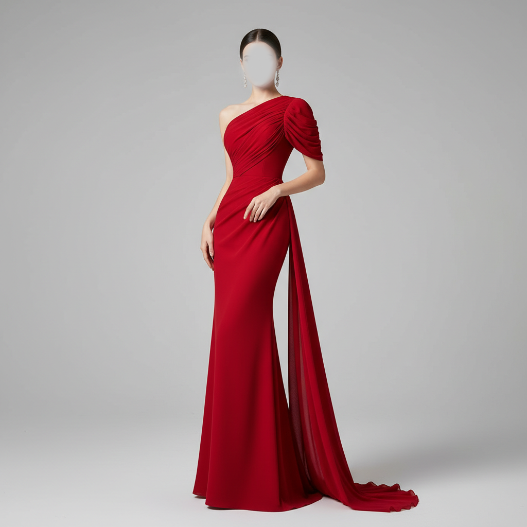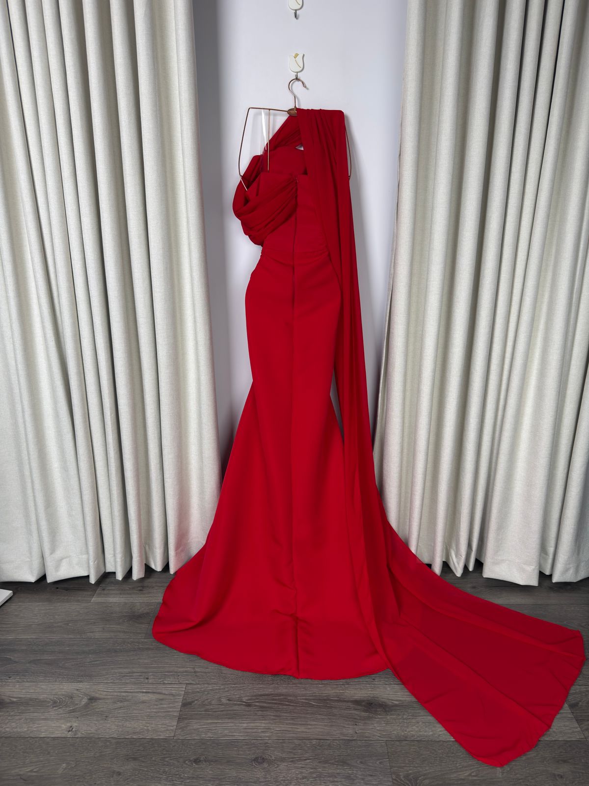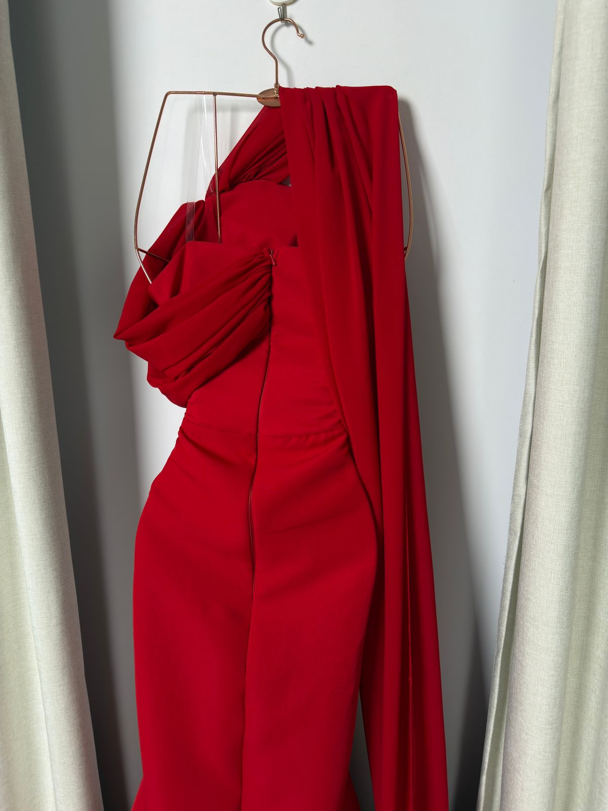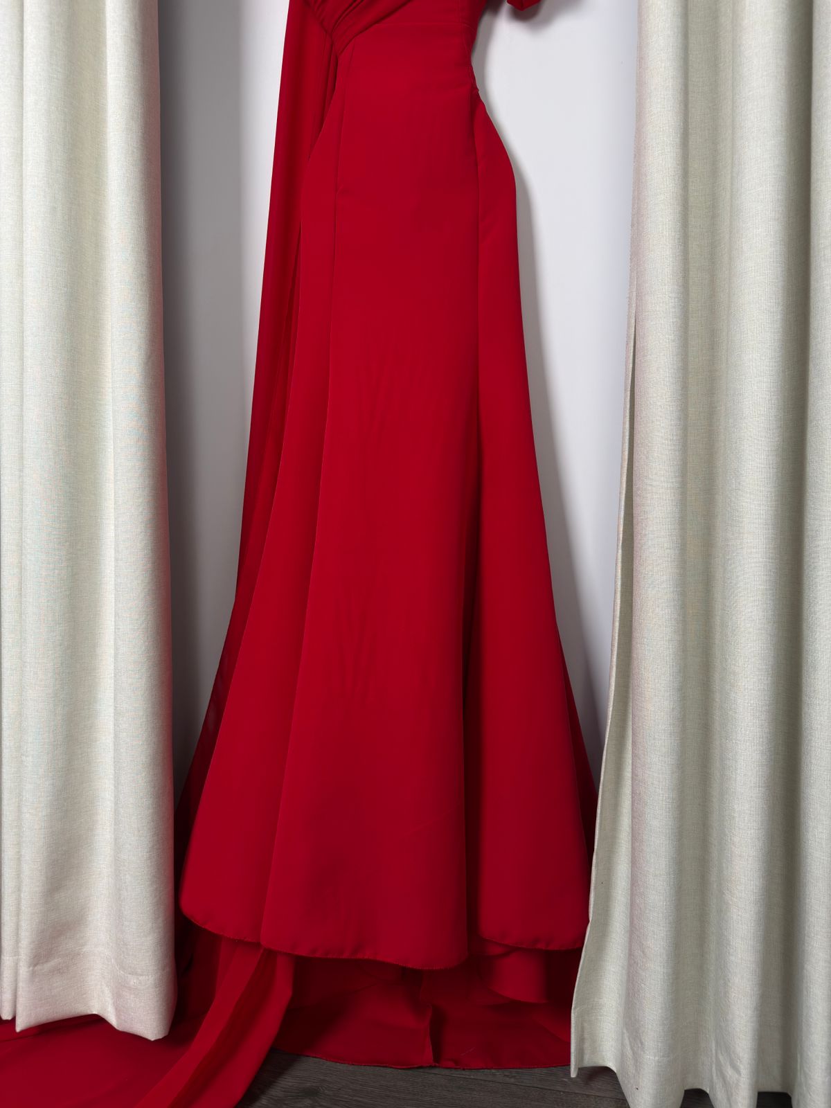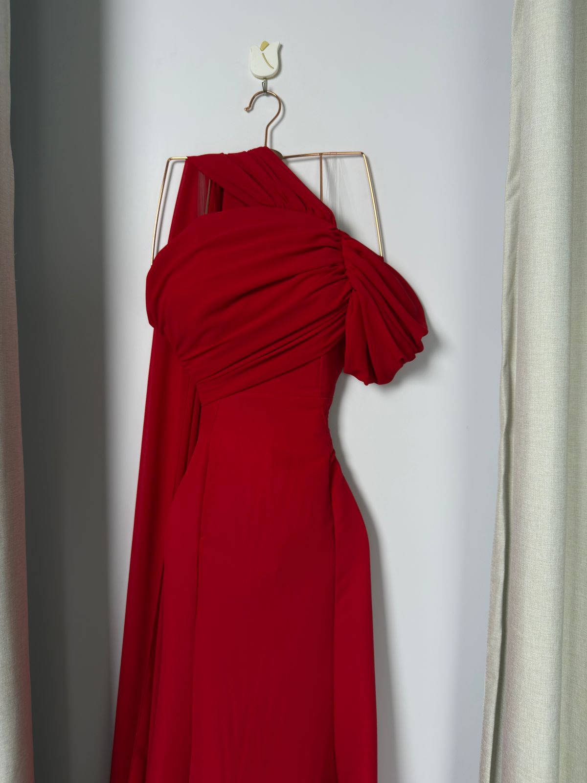 فستان سهرة احمر يمنحكِ إطلالة أنثوية ساحرة ومتلألئة في كل سهرة. تصميمه الفاخر بكتف واحد والشيفون المنسدل يضفي لمسة فخامة ودرامية راقية.