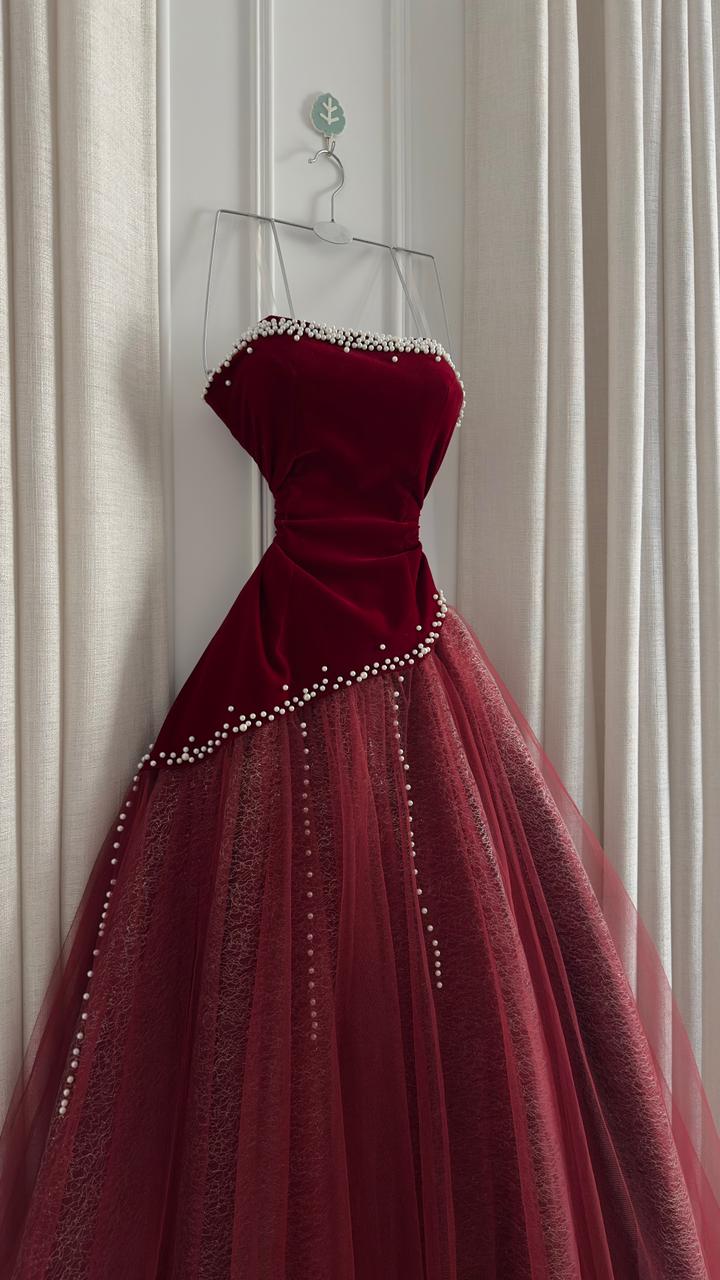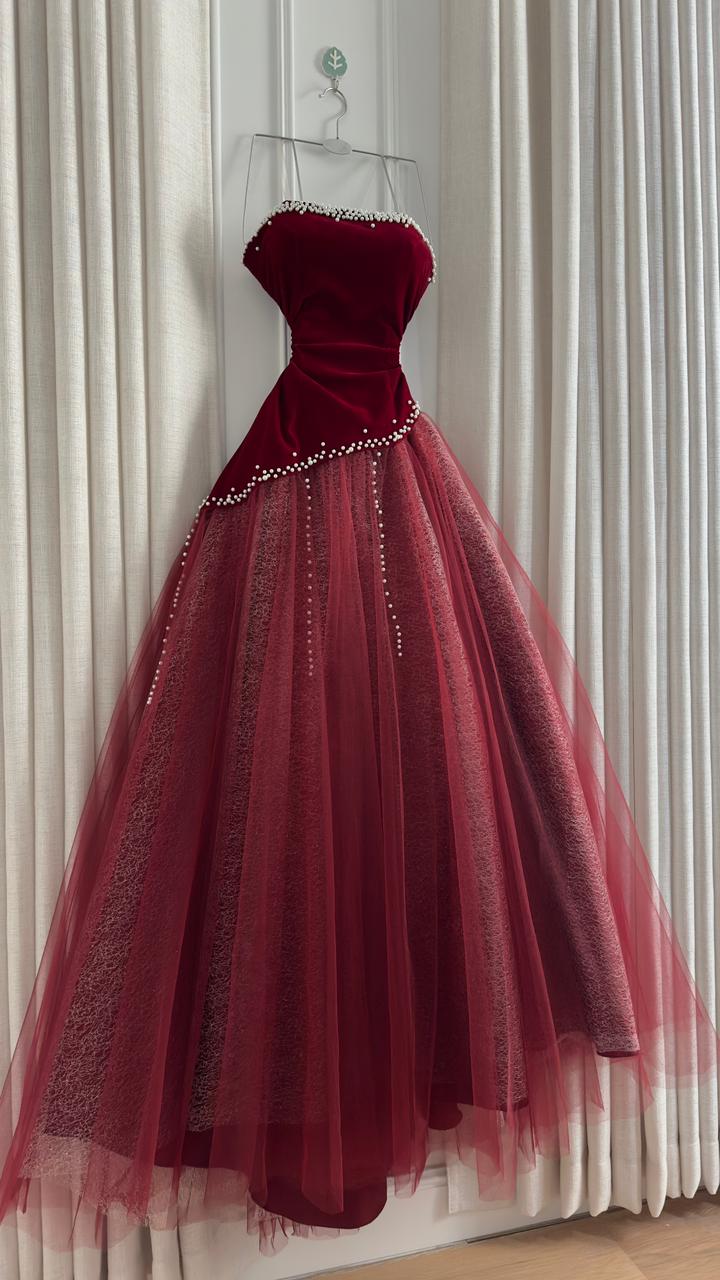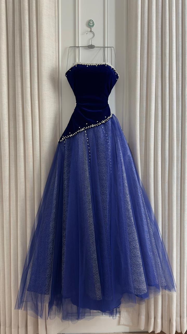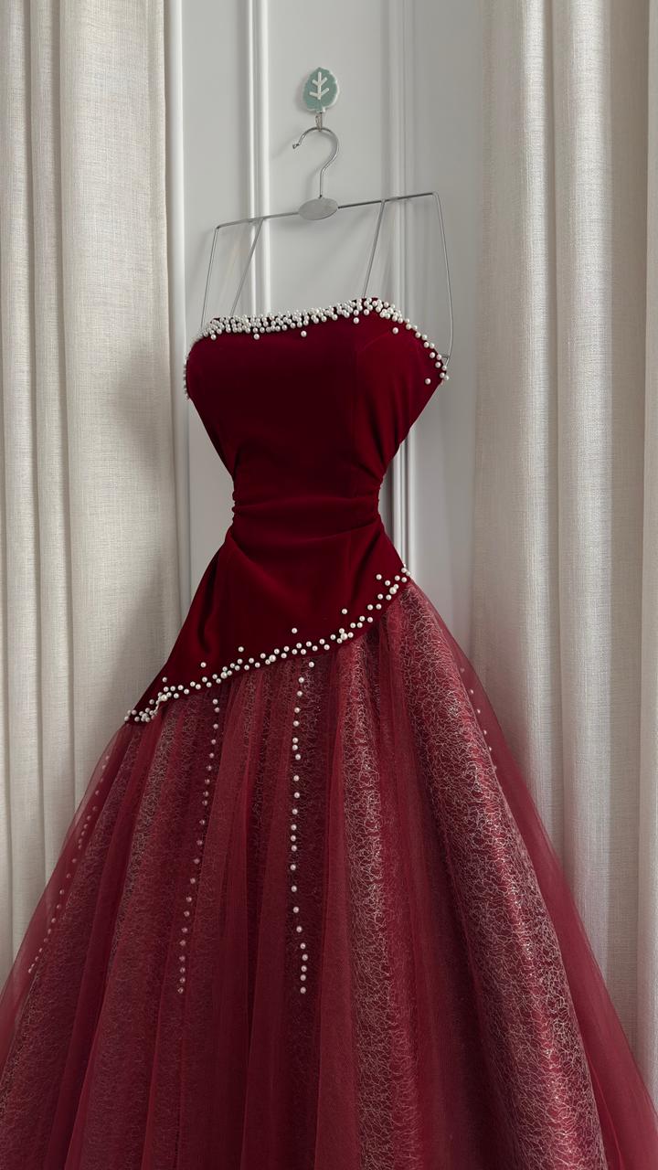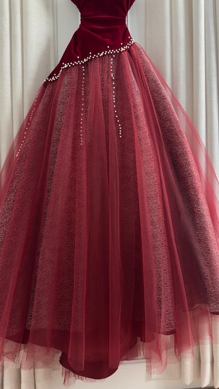 فستان سهرة انيق يجمع بين الفخامة والأنوثة في تصميم ملكي يجذب الأنظار. الجزء العلوي من المخمل والطبقات المنفوشة من التول تضيف لمسة ساحرة لكل مناسبة.