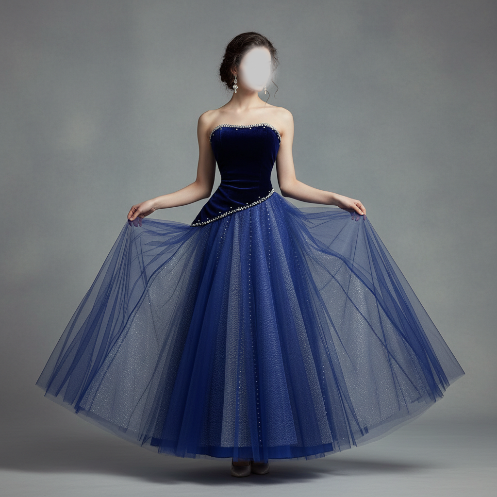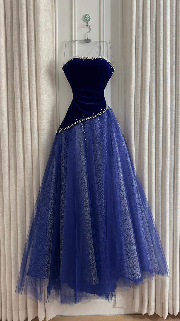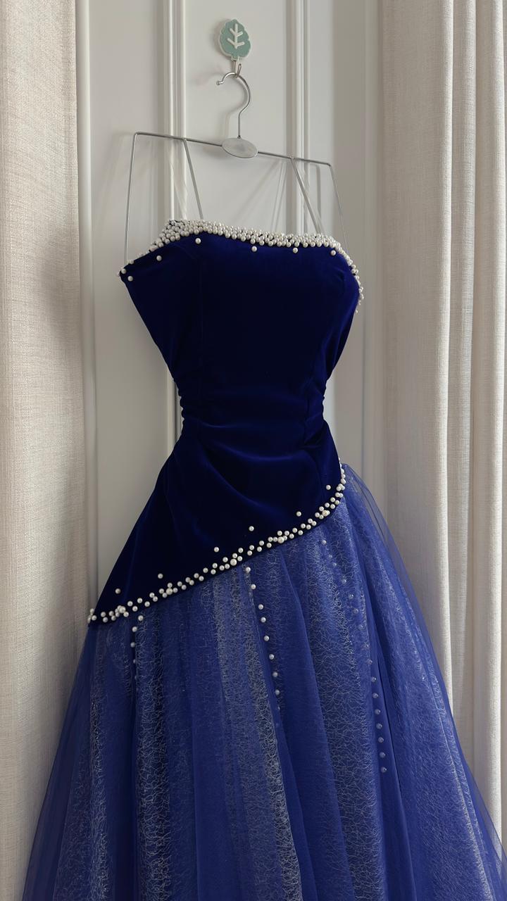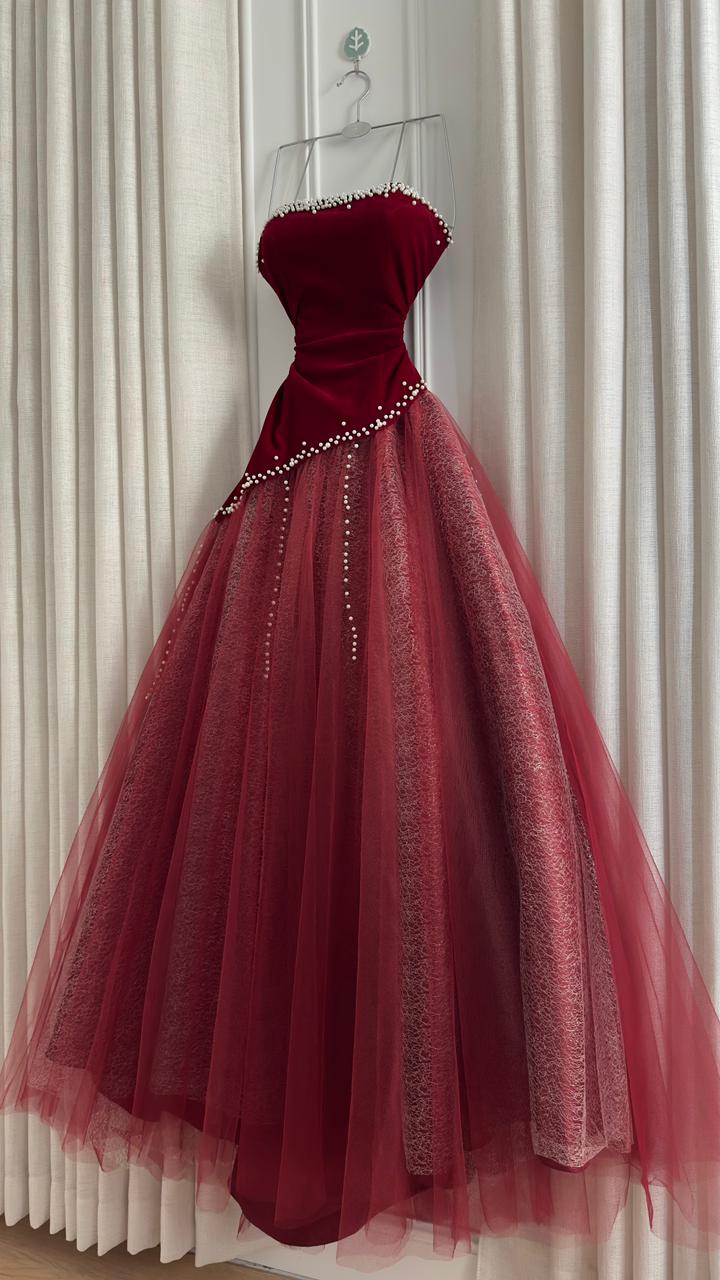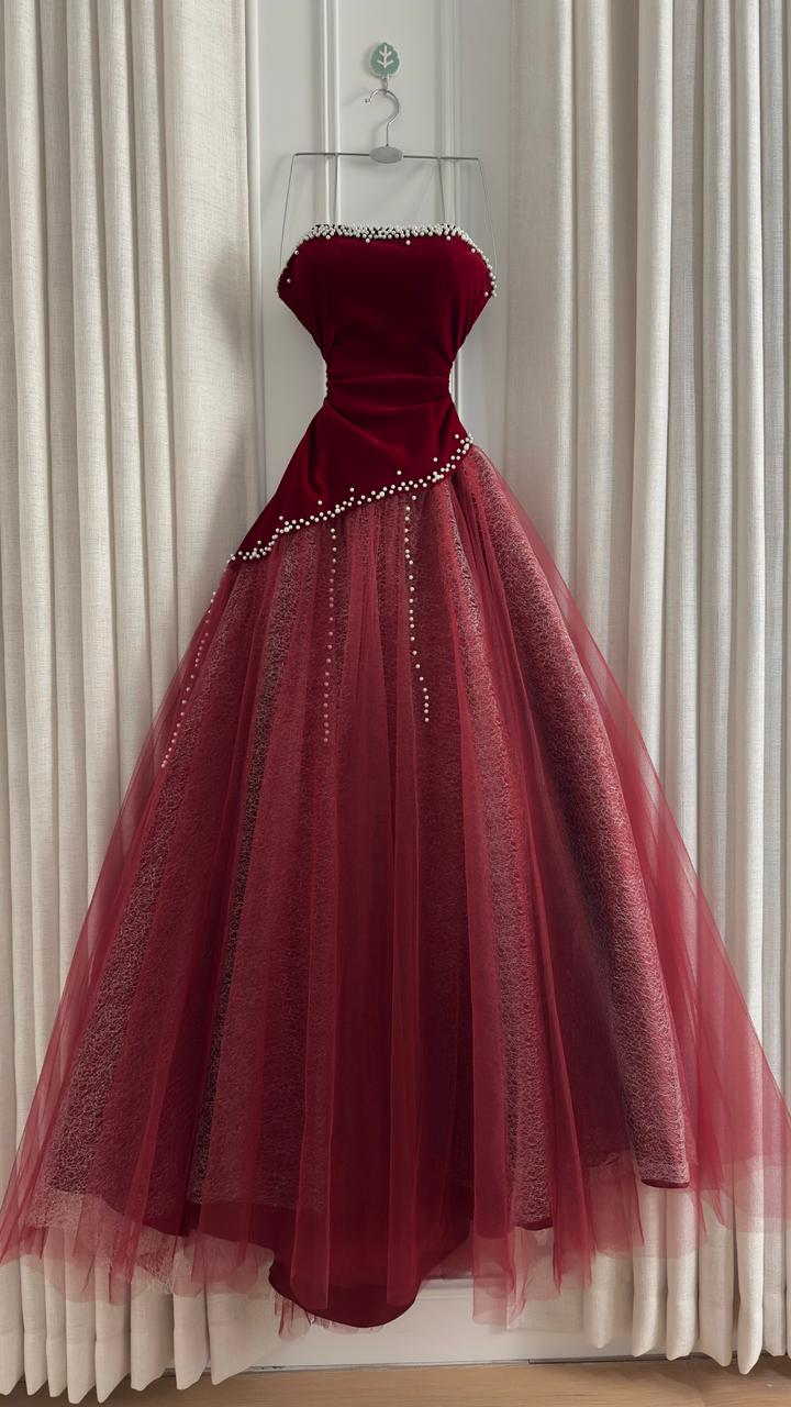 فستان سهرة انيق يجمع بين الفخامة والأنوثة في تصميم ملكي يجذب الأنظار. الجزء العلوي من المخمل والطبقات المنفوشة من التول تضيف لمسة ساحرة لكل مناسبة.