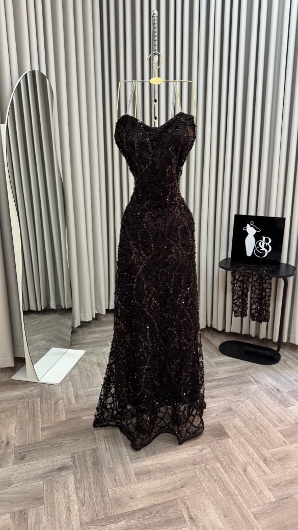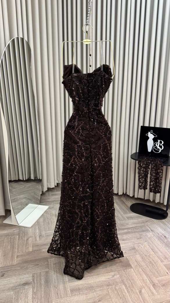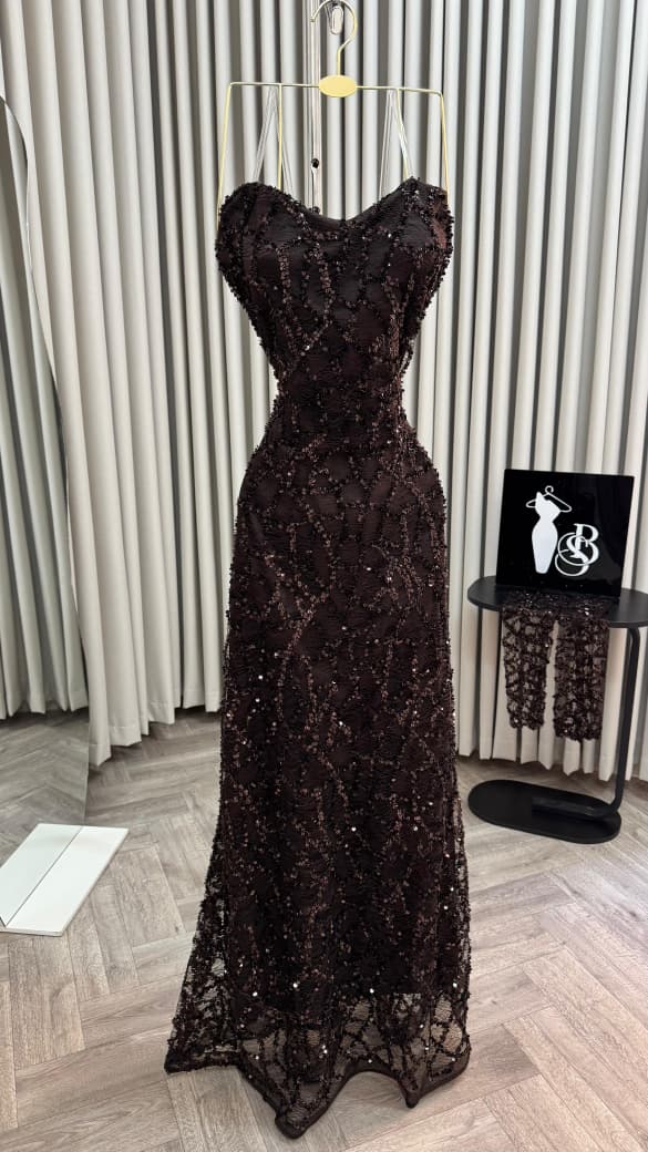 فستان سهرة بني يمنحك إطلالة أنثوية ساحرة وفاخرة في كل سهرة. التطريزات البراقة على الفستان مع التفاصيل الراقية تمنحك بريقاً متألقاً وجاذبية لا تقاوم.