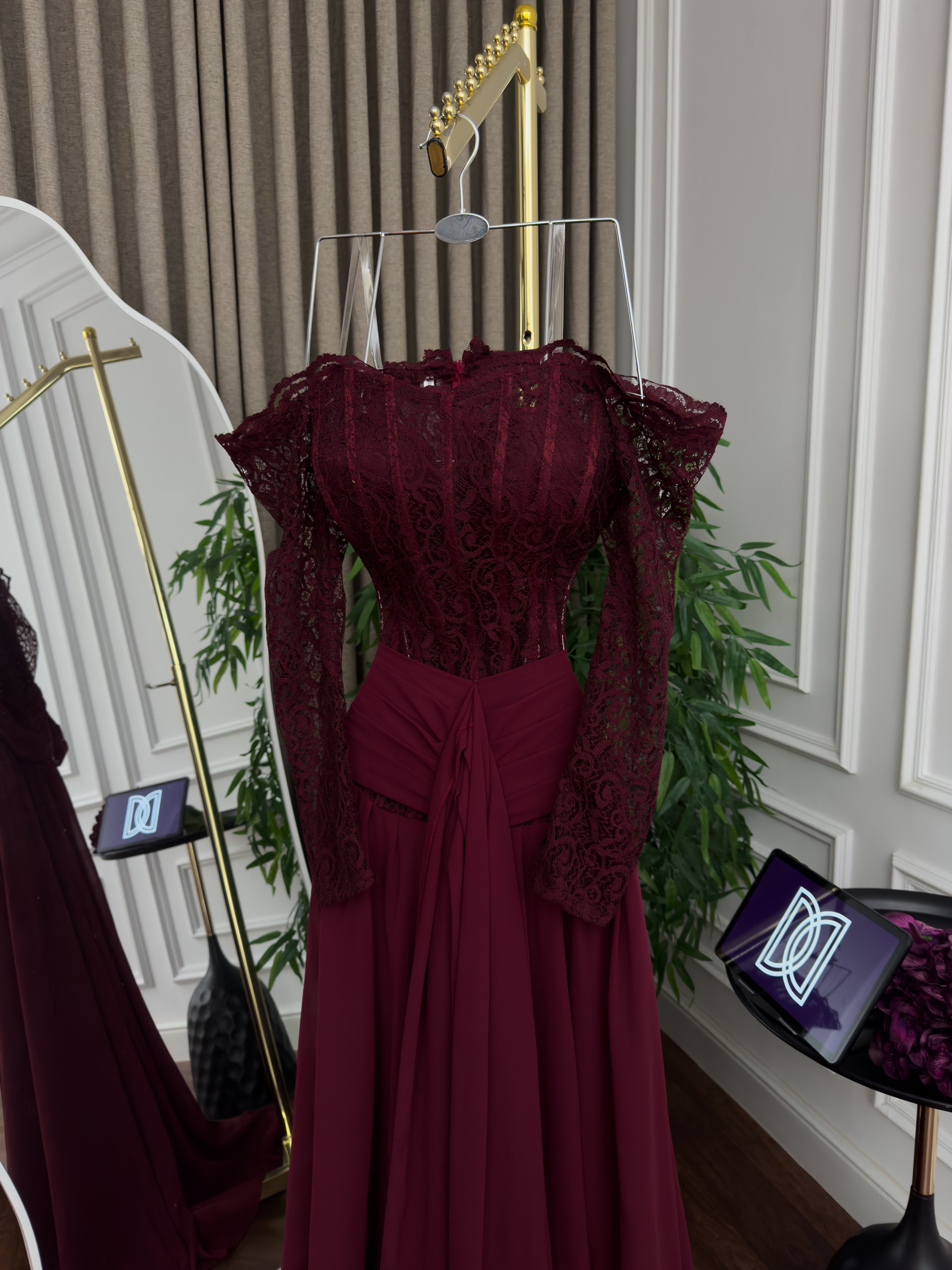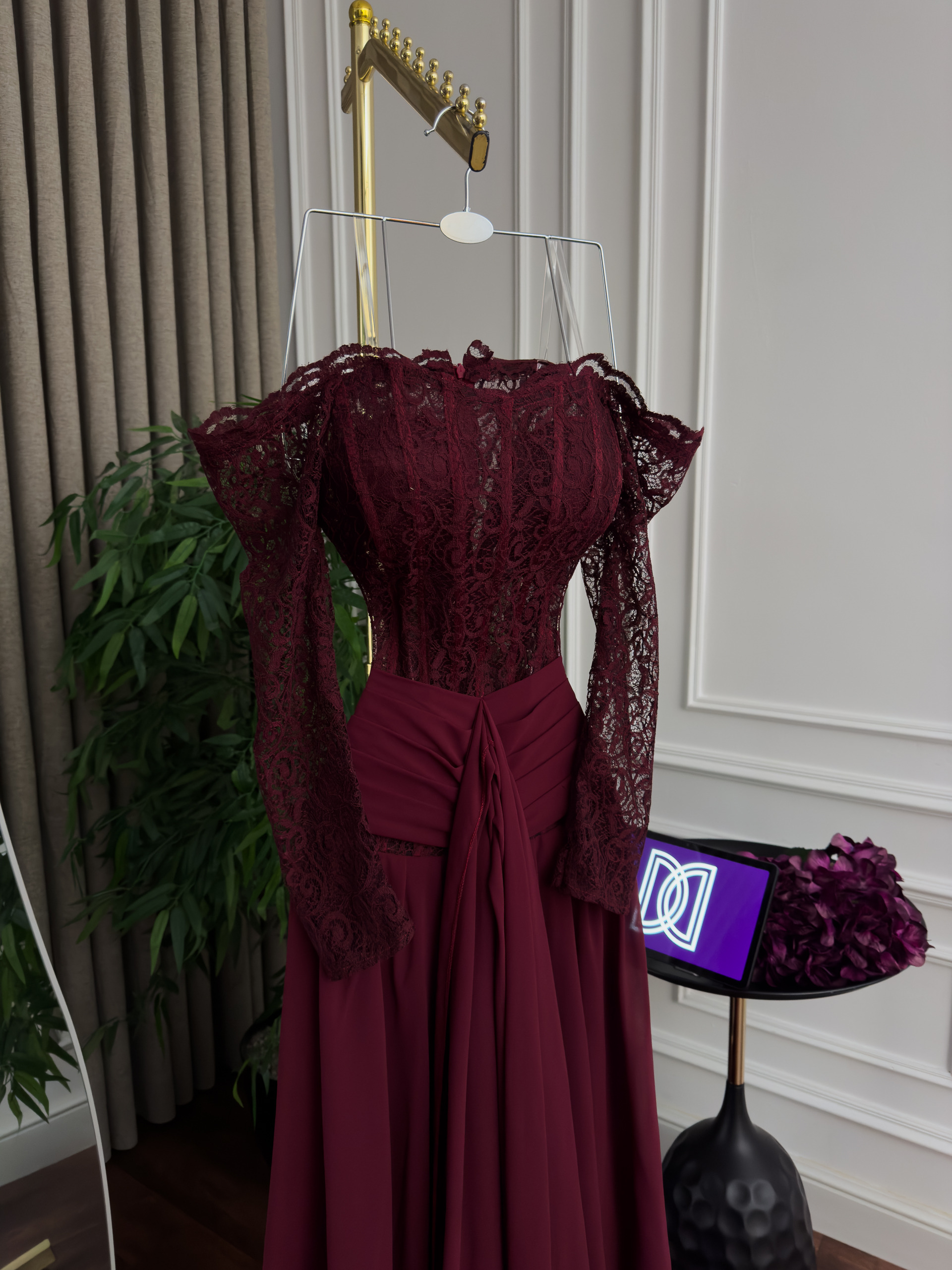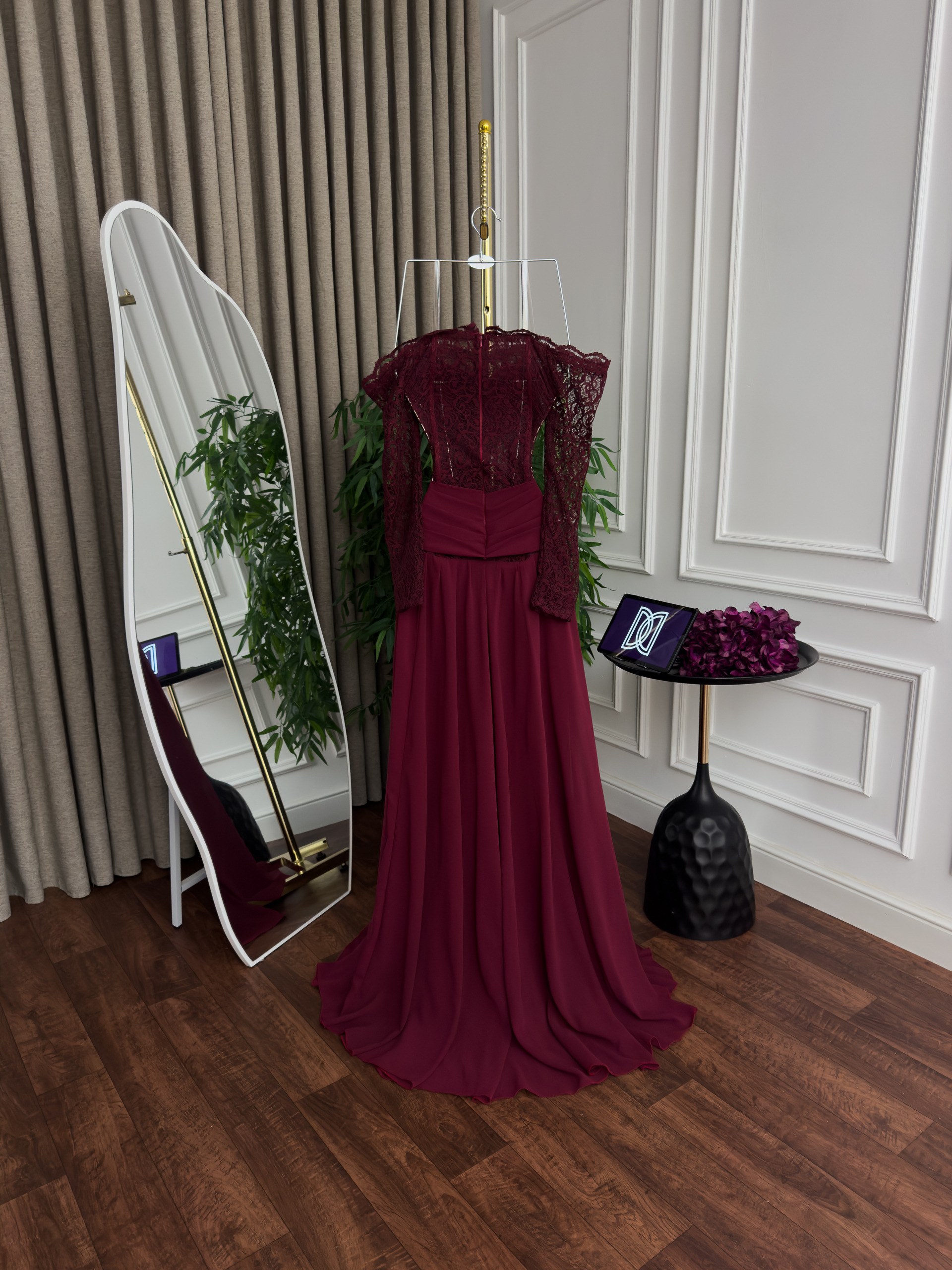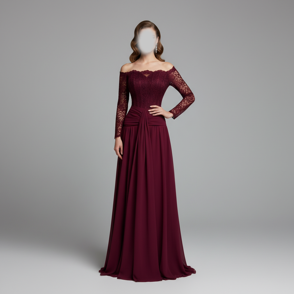 فستان سهرة طويل بتصميم أنيق ولون خمري فاخر يمنحك إطلالة راقية ومميزة في المناسبات والسهرات. يجمع الفستان بين القماش الانسيابي الفخم وتفاصيل الدانتيل الرقيقة في الأكمام والجزء العلوي، ليبرز الأنوثة ويمنحك مظهراً أنيقاً يلفت الأنظار.